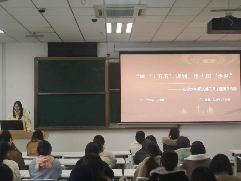 为深入学习贯彻党的二十大和二十届历次全会精神、2026年全国两会精神,全面贯彻落实习近平总书记关于青年工作的重要思想,2026年3月19日,法学2404团支部在博学西楼105教室开展“学‘十五五’规划,悟大国‘治慧’”主题团日活动,活动由团支部书记王智婧主持。