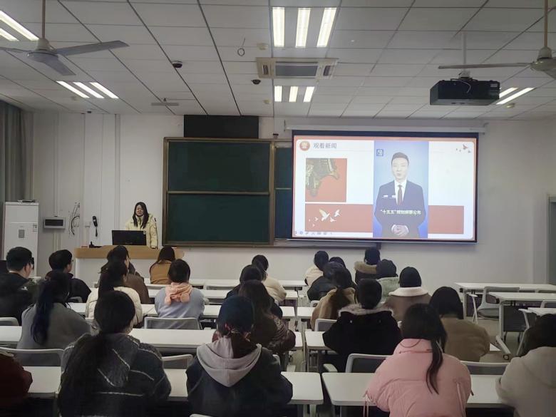 活动围绕“观新闻,明方向”、“读原文,悟治慧”、“共研讨,深交流”三大环节有序展开。在“观新闻,明方向”环节,同学们集中观看“十五五”规划相关新闻报道,直观地了解到2026年全国两会盛况与政府工作报告重点内容,明确国家未来规划方向。